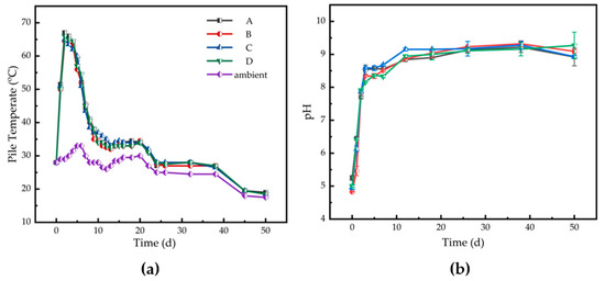 Changes of (a) pile temperature and (b) pH for different treatments during agricultural waste composting. Run A: control; Run B: zeolite addition (5%); Run C: biochar addition (5%); Run D: zeolite (5%) + biochar (5%) addition.
