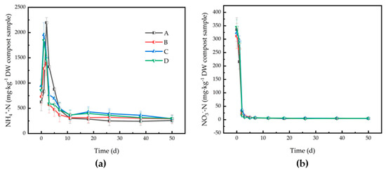 Changes of (a) ammonium (NH4+-N) and (b) nitrate (NO3−-N) for different treatments during agricultural waste composting. Run A: control; Run B: zeolite addition (5%); Run C: biochar addition (5%); Run D: zeolite (5%) + biochar (5%) addition. DW: dry weight.