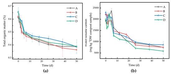 Changes of (a) total organic matter (TOM) and (b) water-soluble carbon (WSOC) for different treatments during agricultural waste composting. Run A: control; Run B: zeolite addition (5%); Run C: biochar addition (5%); Run D: zeolite (5%) + biochar (5%) addition. DW: dry weight.