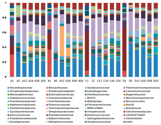 The relative abundance of bacterial populations for different treatments at the family-level during agricultural waste composting. Run A: control; Run B: zeolite addition (5%); Run C: biochar addition (5%); Run D: zeolite (5%) + biochar (5%) addition.