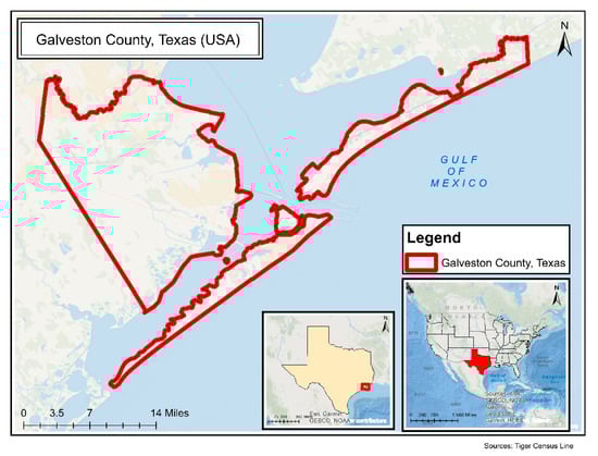 Study Area (Galveston County). Notes: The figure outlines the location of Galveston County in the state of Texas, USA. Datum: NAD 1983, Projection/Coordinate System: UTM Zone 14N.