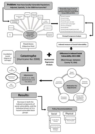 The objective of this study was to identify spatial and temporal adjustment patterns to disasters across vulnerable segments of population. Figure 4 shows the conceptual flow diagram for our problem. Findings in this paper offer important insights into the adjustments of socially vulnerable populations in Galveston County following Hurricane Ike in 2008. Overall, the results surprisingly reveal a statistically significant decrease in both the indexed components of social vulnerability, and the individual drivers of it in hazard-vulnerable block groups. These results seem to contradict past studies, which indicate that low income populations stay in high damage areas [21,22]. This study did not find that the drivers of social vulnerability and SV indices changed in a similar fashion to those in New Orleans following Hurricane Katrina, or Miami-Dade following Hurricane Andrew [21,22]. While it may be impetuous to expect similar results for very different geographic areas, with differing social makeup and scales of impact, searching for redundancy in disaster adjustments can aid in policy creation.