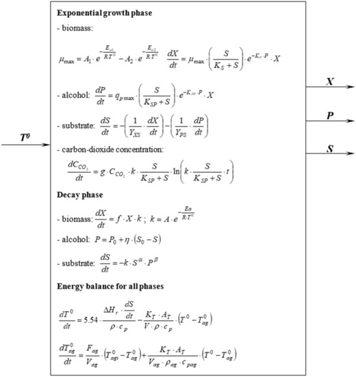 The model of the biomass concentration is disconnected from the models of the P and S variables because the temperature T0 of the fermentation process is an exogenous variable, being established by the loop control.