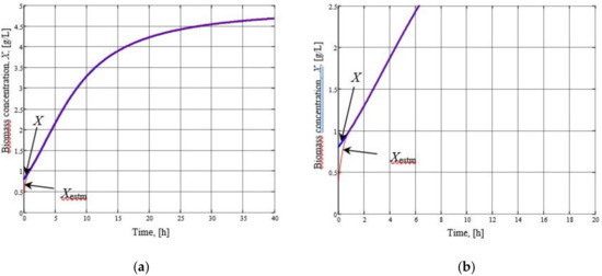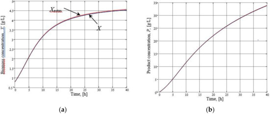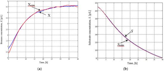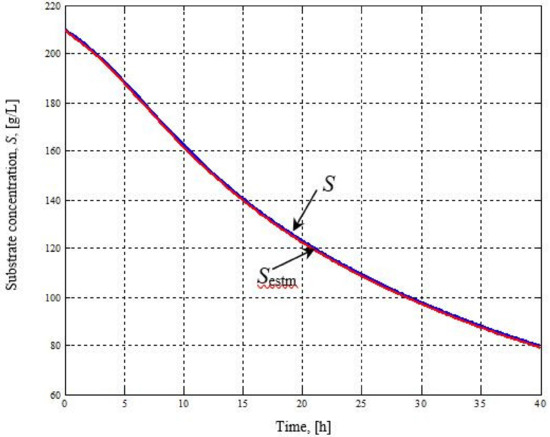 For the validation of the approach presented in Section 2.1, the dynamic evolutions of X and S variables were determined (Figure 2), considered as state variables of the system with the order 3, resulting from Equations (1)–(3) of the model. Practically, the respective variables coincide (the gaps depend on the integration step h). Hence, the results we have achieved to use the product concentration as the output variable and the information from the released CO2 concentration analyzer to be utilized in the control process for identifying in which phase is the alcoholic fermentation process, are realistic.