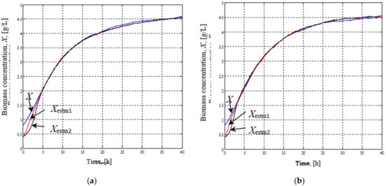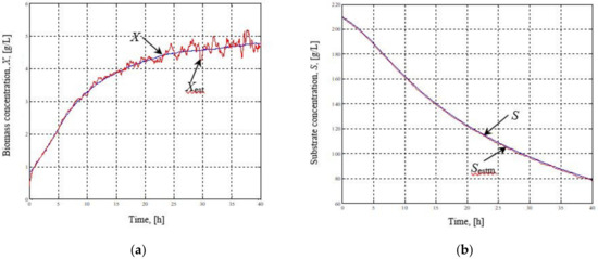 The estimation of the biomass (a) and substrate (b) under noise conditions; p = [−5 − 8].
