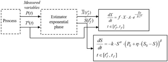 , the and estimations are transferred as initializations of the biomass and substrate concentration state equations. These equations then are integrated, with the measured value of the temperature T0(t) also known. Following equation initialization, the estimations are obtained by the integration of the state equations.