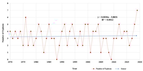The frequency of typhoons by year is shown in Figure 2. Korea was affected by an average of 3.3 typhoons annually, with a standard deviation of 1.5. The minimum number of typhoons generated during the survey was zero, and the largest number of typhoons affecting Korea was seven. The linear regression model of typhoon frequency is y = 0.0036 × Year – 3.8831. The R2 value is 0.0012. The slope of this model shows that the relationship between the year and number of typhoons is positive, indicating that the number of typhoons has increased slightly each year. However, the R2 value shows that the relationship between the year and number of typhoons is very weak, since the value is extremely low. Hence, it would be difficult to conclude that climate change has a clear impact on the number of typhoons.