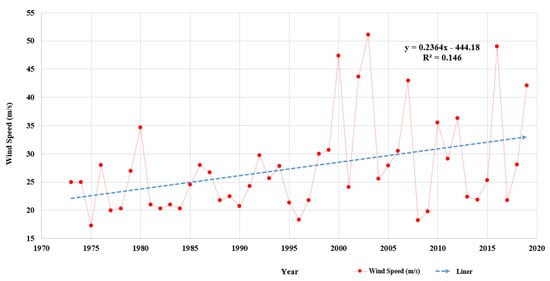 The linear regression model of typhoon severity is y = 0.02364 × Year − 444.18. The R2 value is 0.146. The slope of this model shows that the relationship between the year and maximum wind speed is positive, indicating that the maximum wind speed has increased each year. Furthermore, the R2 value shows that the year and the maximum wind speed have a weak quantitative linear relationship.
