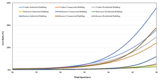 Figure 4 illustrates the vulnerability functions for each model. This study used the vulnerability function of loss ratio for wind speed and occupancy. Occupancy, a representative relative vulnerability factor, was used to reflect the vulnerability of building inventory. Occupancy is used in risk management and risk assessment models among other building inventory information. Occupancy also refers to a similar accounting policy in insurance that categorizes buildings as industrial, residential, and commercial. This classification of buildings according to occupancy refers to building units with similar physical and financial characteristics. This study also adopted the occupancy classification and divided buildings into industrial, residential, and commercial groups.