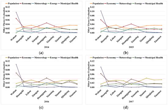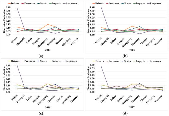| Impacts | Daily water consumption per capita (I1), industrial water consumption (I2), agricultural water consumption (I3), domestic water consumption (I4), urban water supply quantity (including self-built facilities) (I5), quantity of water for production and operation (I6), quantity of water for household use (I7) | Green coverage area of built district (I8) | Excellence rate of air quality (I9), household gas quantity (I10), gas-powered automobiles gas quantity (I11), household fuel quantity (I12) | Industrial electricity consumption (I13), electricity consumption of urban and rural residents (I14) |