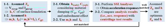 Figure 2 summarizes the procedure used to identify the optimum parameter using an analytical approach and test. The objective of the procedure was the identification of the optimum and . As an analytical approach, the time domain SSI analysis by the state space equation (SSE) was adopted and dynamic centrifuge tests were performed at the 20 g level.
