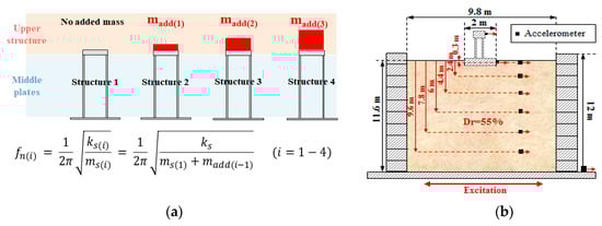 Model structures and tested soil–structure system: (a) Model structures for impact hammer tests, and (b) tested soil–structure system.