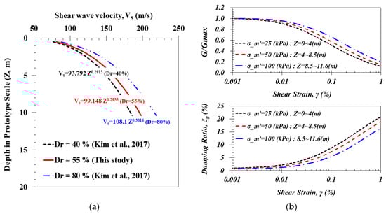 Dry silica sand layers were prepared with a relative density () of 55% by using sand rainer. The properties of silica sand are listed in Table 5, and the profiles are shown in Figure 4a. In this case, USCS is the unified soil classification, is the median particle size, is the specific gravity, is the maximum void ratio, is the minimum void ratio, is the dry unit weight of the soil, is the internal friction angle of the soil, and is the calculated coefficient of the earth pressure at rest based on Jacky’s formula (i.e., ). Kim et al. [31] obtained the profile by performing in-flight bender element tests on the silica sand with the relative densities of 40% and 80%. In this study, the profile was obtained by interpolating the results of Kim et al. [31]. Finally, the profile was acquired based on the relationship. Resonant column tests were performed with mean effective stress values = 25, 50, and 100 kPa, and the results were used in one-dimensional equivalent SRAs, as shown in Figure 4b, wherein is the modulus reduction curve of the soil, is the damping ratio curve of the soil and is the mean effective stress that can be calculated as .