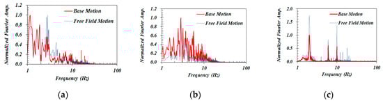 Frequency contents of the motions at base and free field: (a) Hachinohe IV, (b) Northridge II, and (c) Synthesized I.