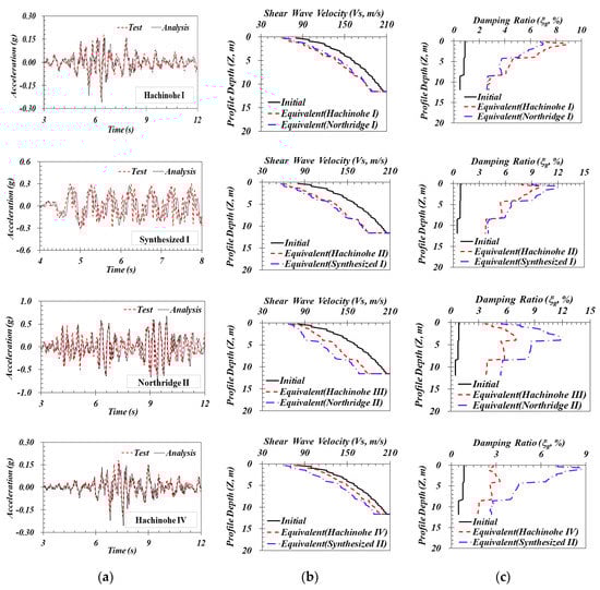 One dimensional equivalent linear SRAs, One of the methods that can be used to obtain the acceleration response of the soil layer and to obtain the equivalent linear soil properties, were conducted to obtain strain-independent and values with the program STRATA that was developed by Kottke and Rathje [34]. Figure 6a shows that the ATHs from SRAs match well those from the test results at Z = 0.3 m, and Figure 6b,c shows the equivalent and -depth results (i.e., the strain-independent depth and -depth relationships) at their final effective shear strain values.