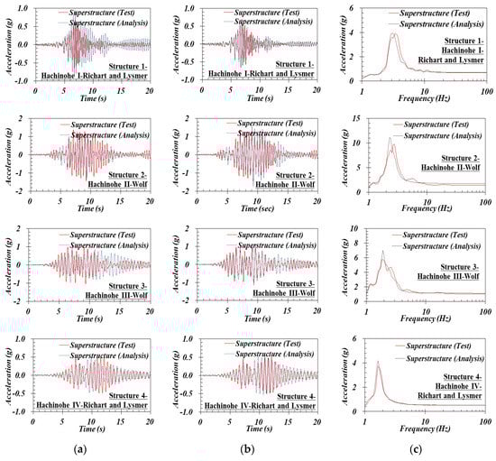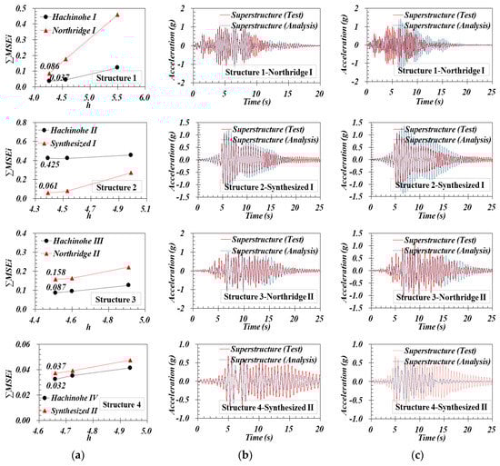 To evaluate the differences in phase, amplitude, frequency contents, and amplification characteristics between the test and analysis results, the mean squared errors (MSEs) for ATH and response spectrum (RS) of each superstructure were obtained in the forms of and , respectively, and their sums (i.e., ) were used to comprehensively evaluate the conformity of the analysis to the test results. In Equations (13) to (15), and were the acceleration responses of the test and analysis at a certain time t = k, and and were the spectral acceleration values of the test and analyses at a certain frequency f = j, respectively. When the value of is small, the overall agreement between the test and analysis results is better.