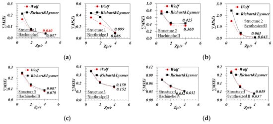 In the evaluation of the optimum effective profile depth (), 48 analyses were conducted in total (i.e., 48 cases = four structures × two input motions/structure × three effective profile depths × two types of formulas), wherein the embedment correction factor suggested by Whitman [6] and was used in common. The analysis cases are summarized in Table 8.