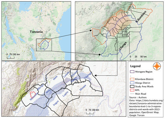 Location: The valley is positioned at the foot of the Great Escarpment of East Africa in the southern half of Tanzania, about 300 km from the coast [5,6], and lies between longitudes 34.563 and 37.797 E and latitudes 7.654 and 10.023 S (See Figure 1) [52]. It covers an area of about 11,600 km, with a total length of 250 km and a width of up to 65 km. The floodplain is surrounded by the Udzungwa mountains in the northwest and the Mbarika Mountains and Mahenge Highlands in the southwestern parts [53]. The peak elevation drops from an altitude of more than 1800 mamsl to about 300 mamsl in a few kilometers. Generally, the floodplain is humid with high temperatures ranging from 26 C to 32 C. While the relative humidity in the mountains is between 70–87%, the lowlands experience 58–85% humidity with average potential evaporation of 1800 mm [52]. KVF is a typical fertile alluvial floodplain with loamy, clay, clay loamy and sandy soils and is an essential source of nutrients and sediment [1,6].