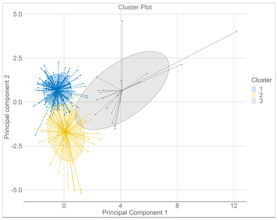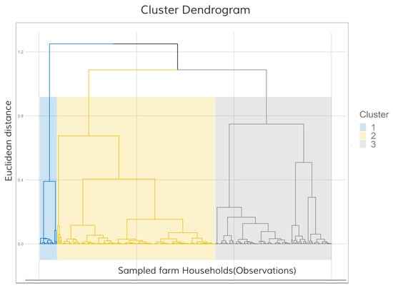 Using the hierarchical and k-means clustering, a three-cluster solution was obtained. Figure 2 provides the tree-based representation of the observation, also known as a dendrogram. Moreover, partitioning in three clusters is represented on the scatter plot produced by the first two principal components, and the dots (representing farmers) are colored according to their cluster group Figure 3. The cluster dendrogram shows explicitly three different farm groups identified by the cluster analysis. Table A1 presents the variables that discriminate each cluster group.