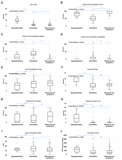 Figure 4 provides the box plots for the characterization of the three farm groups. To test if there is a significant difference between the groups, a pairwise mean comparison is conducted. As shown in the plots, there is a significant difference between the Agropastoralist and Diversifier types in terms of farm size (Figure 4A), land allocated to crops (Figure 4B–D), household size (Figure 4F), TLU (Figure 4H) and per capita income (Figure 4J). Similarly, the results show a significant difference between Agropastoralists and MCRP in terms of farm size (Figure 4A), land allocated to crops (Figure 4B–D), commercialization index (Figure 4E), household size (Figure 4F), share of hired labor (Figure 4G), TLU (Figure 4H) and per capita income (Figure 4J). Looking at the difference between MCRP and diversifiers, there is a significant difference between the two farm groups in farm size (Figure 4A), land allocated to crops (Figure 4B–D), commercialization index (Figure 4E), the share of hired labor (Figure 4G) and age of the household head (Figure 4I).