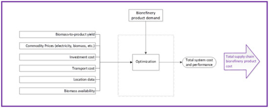 A variety of design variables affect the economic performance of a biorefinery, such as choice of location, feedstock, conversion technology, and final product(s). These aspects are commonly included in assessments conducted using supply chain optimization models [8,9], which minimize the system costs for a given set of constraints. Typically, feedstock and product transport costs are determined endogenously, whereas biomass-to-product yields and feedstock prices are included exogenously. However, some supply chain modeling frameworks have also included selection of key process design variables [10,11]. While all main design decision variables are considered in these cases, the output may nevertheless be misleading since market price interactions are typically not acknowledged.