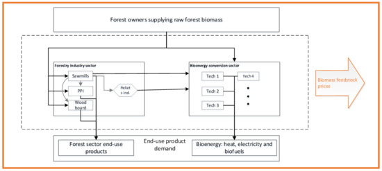 Figure 4 illustrates the main actors and biomass flows in the proposed model. In this setting, the forest industries, and the bioenergy sector both demand biomass, either as a feedstock or as fuel. The forest industries also act as suppliers of by-products both within the sector, and to the bioenergy sector. The dashed box in Figure 4 represents the interconnection between the forestry industry and the bioenergy conversion sector. The smaller boxes inside this box represent the industries and bioenergy conversion activities (representing different technology conversion options e.g., combined heat and power, heat-only production, or gasification for production of biofuels) which are represented by input–output coefficients.