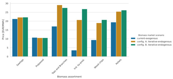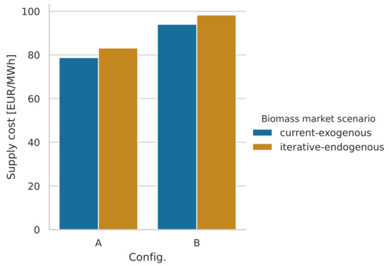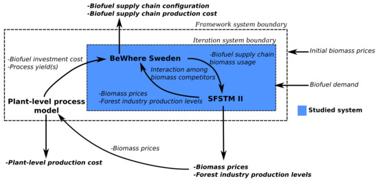 Uncertain price developments, if accounted for, are usually managed in supply chain modeling approaches of biorefineries or bioenergy projects through the use of various price and demand scenarios [10,16,17], or stochastic price processes to simulate future prices [18]. Both historic price data [19] and future price predictions from established analytics centers [20] have been suggested as commodity price data to be used in techno economic assessments. Relatedly, previous research has combined market analysis with techno-economic analysis [21], and vice versa [22]. However, these approaches do not consider the price dynamics caused by the change under evaluation, e.g., impacts on biomass feedstock prices resulting from the introduction of large-scale forest-based biofuel production, and/or the effects on other users. This has been acknowledged by Mustapha et al. [23], who combined economic modeling with energy system modeling to analyze the effects on the Nordic heat and power sector of large-scale forest-based biofuel production. The results showed significant impacts on the use of biomass for heat and power production, and the authors stressed the importance of accounting for the competition for biomass when evaluating large-scale introduction of bioenergy conversion technologies.