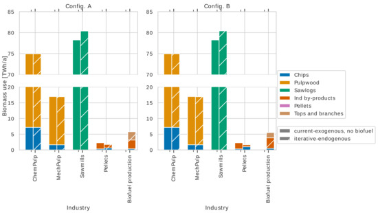 The market model used is the Swedish forest sector trade model (SFSTM II), which is a PE model that simulates the Swedish forest biomass market (based on [84,85,86], including the Swedish forest sector, and the bioenergy-using heat and power sector and transport (biofuel) sectors. The model encompasses the national borders of Sweden divided into four regions, and an additional region covering trade with the rest of the world. The model is a nonlinear programming model written in GAMS using CONOPT as the solver, and the model objective is to maximize total consumer and producer surplus to obtain equilibrium prices, industry production levels, and resource allocation; see [53,86] for a more detailed overview of the model as applied in the chosen context. The maximization of the producer and consumer surplus is dependent on the following decision variables, which are all continuous: demand of consumer goods (e.g., sawn wood, heat, and power), harvest of roundwood and harvesting residues, new industrial production, output of main products (e.g., production from forest industries), roundwood delivered, new industrial production capacity, quantity traded between regions, and quantity of energy demand. The reference year for industrial production levels and biomass prices is described in Section 4.2.2.