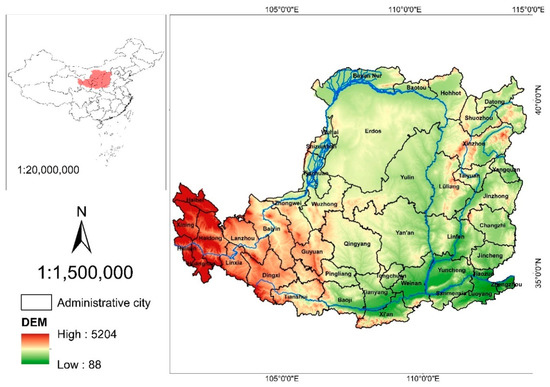 The LP (33°43′–41°16′ N, 100°54′–114°33′ E) is located in north-central China, with an area of about 620,000 km2. It is more than 1000 km long from east to west and 750 km wide from north to south; the elevation ranges from 88 to 5204 m (Figure 1). The LP belongs to the temperate continental climate zone; its annual temperature ranges from 4 to 14 °C, and its annual precipitation, from 200 to 750 mm. The unevenly distributed precipitation (60–70% of rainfall occurs between June and September) and the most concentrated and largest distribution of loess soil in the world have shaped a very complicated topography, including basins, sub plateaus, hills and gullies. Around 8.5% of the Chinese population lives in ca. 6.6% of China’s territory; the population density reaches 168 people/km2 [33]. The LP covers 44 administrative cities in seven provinces, including the Inner Mongolia Autonomous Region and Qinghai, Gansu, Ningxia, Shaanxi, Shanxi and Henan provinces.