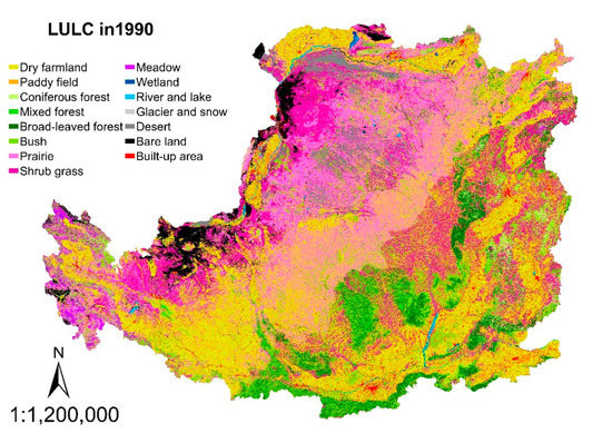In 1990, the LP was predominantly covered by grasslands, including prairies, shrub grass and meadows (ca. 23 million ha, taking up 37% of the region); dry farmland (ca. 19 million ha, taking up 31%); and forestlands, including coniferous forests, broad-leaved forests, mixed forests and bush (ca. 13 million ha, taking up 21%). Grasslands were mainly located in the center and southwest of the LP; dry farmland was distributed in the north, east and south; and most of the forestlands were found in the east (Figure 2). Bare land accounted for 4% of the LP; built-up areas and deserts respectively occupied ca. 3 %; wetlands, rivers and lakes as well as glaciers and snow together accounted for less than 1% (Table 3).