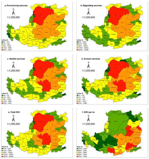 At the municipal scale, in 1990, Erdos provided the greatest value of provisioning services (more than $2 million), while Wuhai and Hainan provided the smallest ones (less than $100 million; Figure 4a). Erdos also had the largest value of regulating services (more than $30 million), while Wuhai and Zhengzhou had the smallest ones (less than $1 million; Figure 4b). The greatest values of habitat services were found in Erdos and Yan’an (more than $2 million), while the smallest ones were found in Zhengzhou and Wuhai (less than $100 million; Figure 4c). The largest values of cultural services were also provided by Erdos and Yan’an (more than $1 million), but the smallest ones were found in six cities (less than $100 million; Figure 4d). In total, the ESVs of Erdos and Yan’an were greater than $20 million, while the ESVs of Wuhai and Zhengzhou were smaller than $1 million (Figure 4e). On average, the highest unit ESVs (more than $7000/ha) were found in Jiaozuo, Lüliang, Yuncheng, Baoji and Yangquan, while the lowest ones (less than $4000/ha) were provided by Dingxi, Guyuan, Baiyin, Hainan, Hohhot, Shuozhou and Qingyang (Figure 4f).