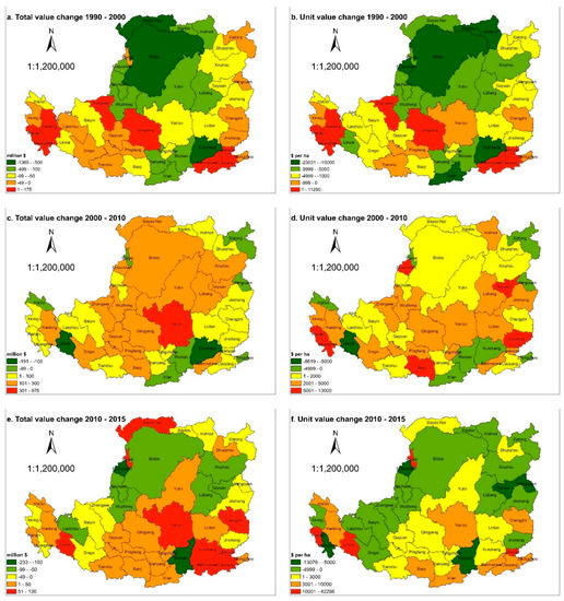 The changes in the total and unit ecosystem service values from 1990 to 2015.