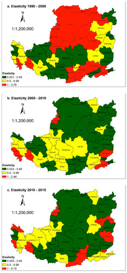 At a municipal level, cities had different elasticities in the three periods. Between 1990 and 2000, 19 cities were very elastic, among which Baotou had the largest elasticity at 3.78 (Figure 6a). From 2000 to 2010, only seven cities had an elasticity over 1, among which Huangnan had the largest one at 2.44 (Figure 6b). During the last period, the elasticities in 11 cities were larger than 1, among which the elasticity in Linxia was the greatest one, even reaching 9.18 (Figure 6c). The elasticity of a city varied obviously in different periods. This was determined by the conversion of LULC types, their areas and the ESV changes resulting from the conversion. In the three periods, the elasticity of three cities on the LP were always larger than 1, i.e., Wuhai, Shizuishan and Linxia (Figure 6).