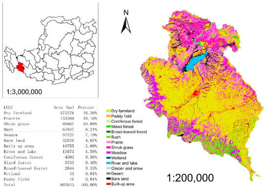 The 30 × 30 m raster of LULC data from 1990, 2000, 2010 and 2015 were obtained from the ChinaCover dataset, which includes six primary classes (forestland, grassland, cropland, wetland, built-up land and other land) and 40 secondary classes. This dataset has been validated by over 100,000 ground test samples and 13 rounds of large-scale cross-checks; the average accuracy for 2010 reaches 94% in the primary classes and 86% in the secondary classes [39]. In order to be in accordance with the LULC classification used by [40], the ChinaCover data was redefined (Table 1).