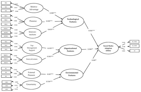 All research hypotheses were supported as shown in Figure 1 and Table 5. Technological features (b = 0.532, p < 0.001), organizational features (b = 0.194, p < 0.010), and environmental features (b = 0.187, p < 0.050) of social media are found to have a statistically significant positive prediction impact on the adoption rate of social media. Likewise, all the first order variables, namely relative advantage (b = 0.207, p < 0.001), presence (b = 0.177, p < 0.001), interconnections (b = 0.241, p < 0.001), top management support (b = 0.112, p < 0.001), innovativeness (b = 0.110, p < 0.001), external pressure (b = 0.095, p < 0.001), and environment uncertainty (b = 0.532, p < 0.001) exert a statistically significant positive predictive influence on the adoption rate of social media.