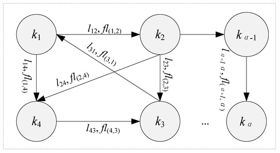DFND can be described as DF = (K, L, FL), where K represents the set of all nodes, the nodes correspond to the subfunctions in the function structure model, and K = (k1, k2, …, kα), G = {1, 2, …, α} L represents a set of directed edges, and the directed edges correspond to the path of function failure propagation, are shown in Equation (1). FL represents the set of flows on the directed edge so that the DFND is converted into an adjacency matrix FL with α×α elements, as shown in Equations (2) and (3).