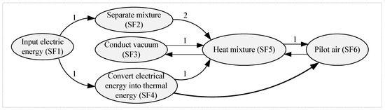 Finally, the indirect effect of function failure (i.e., propagation mode III) is considered. In this propagation mode, for example, when the failure mode of subfunction (SF4) is that the output heat energy is suddenly high or low, it will be transferred along SF5 to SF6, causing the failure of SF6. Thus, a directed edge from SF4 to SF6 is shown in Figure 5.