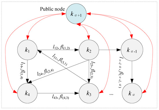 Step B2: By adding a public node on the basis of the original DFND and constructing the edge between the public node and other nodes, as shown in Figure 6. Then, the adjacency matrix FL’ is constructed by adding a node in the matrix FL, as shown in Equations (7) and (8).