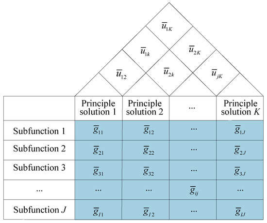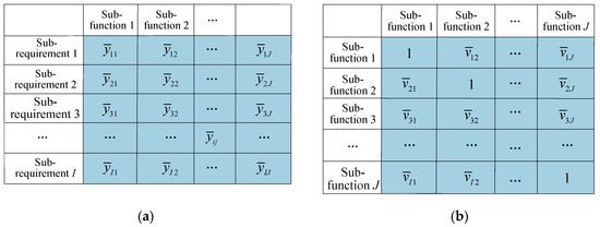 It can be seen that the greater the requirement’s weight is for the functions associated with requirements, the more serious the consequences of the failure of corresponding functions [15]. For this reason, it is necessary to clearly analyze the impact of functional failures on product systems. Then, the sub-requirement-subfunction correlation matrix and subfunction autocorrelation matrix is constructed through the RFP mapping process. Later, the fuzzy evaluation number transformed by Equation (16) is the interval value, as shown in Figure 7, where ij represents the interval correlation value between sub-requirement i and subfunction j, and ja represents the interval correlation value between the subfunction j and a.