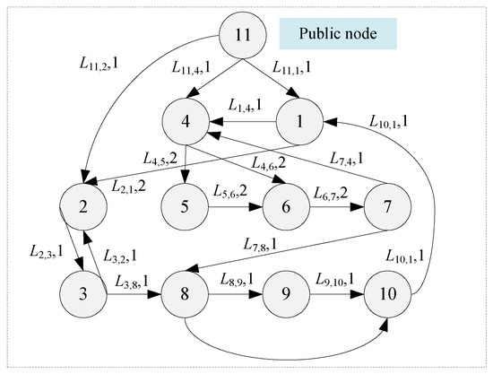 In the process of function failure propagation analysis, the direct impact of functional failure (i.e., propagation mode I) needs to be considered first, which has the highest frequency and is the main way in failure propagation. When the failure of a subfunction is judged to have a direct impact, the corresponding subfunction flow in the function structure model is transformed into the directed edge in the directed weighted network diagram. Based on the transfer of subfunction flow in the function structure model, the flow of DFND directed edge is obtained. In this paper, the flow of subfunction flow is set as “1” and “2”, which respectively indicate that they are important and very important to the normal operation of the system [46], and the specific flow value is determined by the design experts.