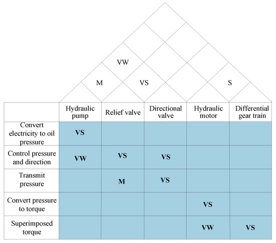 The HOQ of the subfunction-principle solution is shown in Figure 8. The roof of the HOQ is used to express the correlation of the principle solution of the failure. The failure relationship of the principle solutions refers to the correlation strength on the physical structure between the principle solutions, that is, the interaction between the spatial position and the physical connection between the principle solutions. In Figure 8, ij describes the interval correlation value between the subfunction j and the principle solution k (1 ≤ k ≤ K), and k1k2 represents the interval correlation value between the principle solution k1 and k2 in case of a fault.