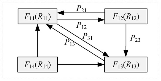 According to the propagation mode of functional failure, the propagation of failure will change the influence of function on the system, so it is necessary to analyze the failure propagation path to obtain the influence degree (ηj) of function failure. For this purpose, this paper constructs a directed functional network diagram (DFND) [29] to convert the functional structure model to DFND and analyzes the failure propagation type of a certain subfunction. Next, based on the DFND, the impact of the fault is analyzed, thereby reducing the design Risk, as shown in Figure 3.