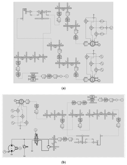 AMESim model implementation for the Schemes 1 and 2. (a) AMESim Simulation model of CS1. (b) AMESim Simulation model of CS2.