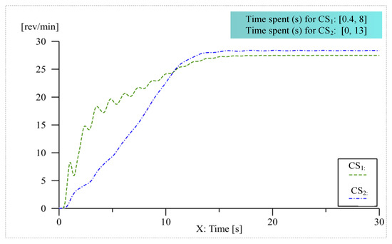After that, the relationship between the roller speed and time for the CS simulation model is analyzed, then the time taken from the fluctuation state of the drum speed to the steady-state is obtained and used as the evaluation value of the speed control performance, as shown in Figure 17.