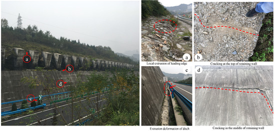 Zhushan Landslide is located on the left side of Section K155+854-K156+178 of Gucheng–Zhuxi Expressway, which is a single expressway construction project with the longest construction mileage and the largest investment scale, as well as the first engineering project to implement standardized construction management in Hubei Province. It is of great significance to the implementation of the two major strategies of the rise of the central region and the development of the western region, and the construction of the ecological and cultural tourism circle in Western Hubei. Once damaged by natural disasters, it will directly affect the contact and communication between the central and western regions and affect the traffic conditions in the mountainous areas of central and Western Hubei. During the construction of the expressway in 2012, part of the landslide collapsed, and anti-slide piles were immediately set up along the road. In 2013, a retaining wall was set between anti-slide pile and expressway. However, the creep deformation of landslide gradually accumulates in each rainy season, which has begun to reduce the function of the support structure and affect the stability of retaining walls, as shown in Figure 1.