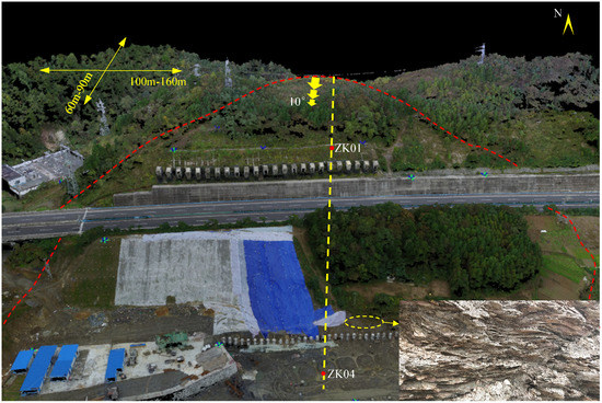 - The creep deformation of the slope occurs after long-term rainfall and stops after the rainy season, which indicates that the starting of the sliding process of the slope is sensitive to water with time effect. As a typical bedding slope, the sliding direction of Zhushan landslide is consistent with the direction of schist schistosity plane, which creates a decisive condition for the instability of the landslide. Rainfall infiltrates into the slope rock mass, and the water content increases, which not only increases the gravity component in sliding direction, but also softens the strength of the rock on the potential slip surface. Under the water–rock interaction, the failure mode of rock on the sliding surface changes from shear failure to sliding failure (or shear and sliding failure), which further reduces the requirement of external force for inducing sliding, and it is an essential condition for the deformation of Zhushan landslide. Based on this, the protection of the slope deformation in the rainy season can be carried out from three aspects. To deal with the sliding mass in sections, transferring the risk of forward sliding. To take measures related to surface protection, reducing the surface water infiltration and fissure water infiltration. To set up a retaining structure, decreasing the probability of sliding mass cutting out from the potential shear outlet.