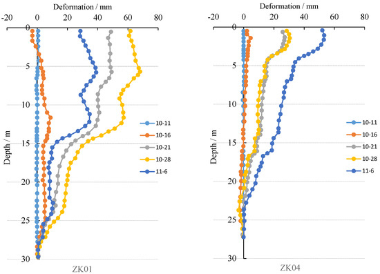 The slope is fan-shaped with a main sliding direction of 10°, the longitudinal length is about 60–90 m, and the transverse length is about 100–160 m (as shown in Figure 2). The bedrock of the landslide is mainly grayish green and grayish black sericite schist, with a single thickness of 1–3 mm. The occurrence of schistosity are the strike 200°–340° with the dip angle of 21°–33°, separation state with aperture distance less than 3 mm, clean without filling and poor combination, which can be defined as weak structural surface. The annual average precipitation in this area is about 990 mm, which is characterized by frequent rainstorms, continuous rainy days, and uneven spatial and temporal distribution. The overall terrain of the landslide area is high in the south and low in the north. A part of atmospheric precipitation is automatically discharged to the southeast in the form of slope flow. While some of it infiltrates the slope overburden and enters the bedrock fissures, and finally flows into the slope bottom. The monitoring data of borehole displacement on the landslide in Figure 3 show that the landslide will have obvious displacement after the rainy season, and there is a significant lag between the occurrence of deformation and rainfall. Therefore, this paper mainly considers the influence of time effect after rainfall on slope stability and sets long-term immersion experiment to study the influence of physical and mechanical properties of schist under water–rock interaction.