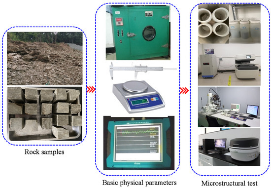 In order to study the influence of water–rock interaction on the stability of schist slope, the schist blocks taken from the landslide area are processed into samples of different scales, and the samples with obvious defects and large discreteness are screened and removed by ultrasonic testing. The mineral composition is mainly composed of quartz, feldspar, muscovite, and clinochlore. The natural density is 2.53 g/cm3 and the saturated density is 2.76 g/cm3. The test scheme is set as follows, and the instruments used are also shown in Figure 4.