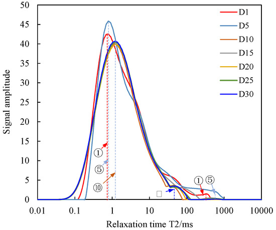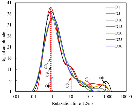The T2 spectrum of typical rock samples after immersion in deionized water for a number of days is bimodal distribution, as shown in Figure 5. With the increase of soaking time, the main wave peak shifted to the left only when soaking for five days. After soaking for 10 days, the main wave peak shifted to the right by a large margin, and a new wave peak appeared at the relaxation time of 1000 ms. After soaking for 15 to 30 days, the main wave peak shifted to the right again. This shows that the pore size of the schist sample decreases during the five-day soaking process. However, the pore structure of schist becomes larger with the prolongation of soaking time, and larger pore size is formed with the breakthrough of small pore.