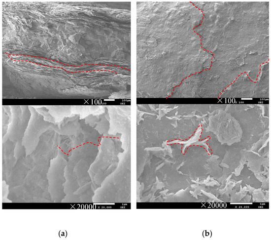 The joints of the test rock are developed well, and quartz, mica, and other minerals are arranged in a certain direction in the process of rock metamorphism, showing obvious anisotropic characteristics. The characteristics of schist parallel and vertical to joint surfaces were observed after soaking in different solutions, to analyze the effect of different solutions on the morphology and mineral crystal structure of schists. The original samples were cut along the vertical and parallel joint surfaces, respectively, and their microscopic images were shown in Figure 8. The vertical microscopic images show that the joints are parallel, the material in the layer is well cemented, and the fracture is ladder-like. After 2000 times magnification, the ladder-like fracture is mainly quartz intergranular fracture, and mica crystals are scattered on the steps (Figure 8a). While the integrity of the images parallel to the joint direction is good, and after 2000 times magnification, lamellar mica intergranular fracture can be seen locally (Figure 8b).